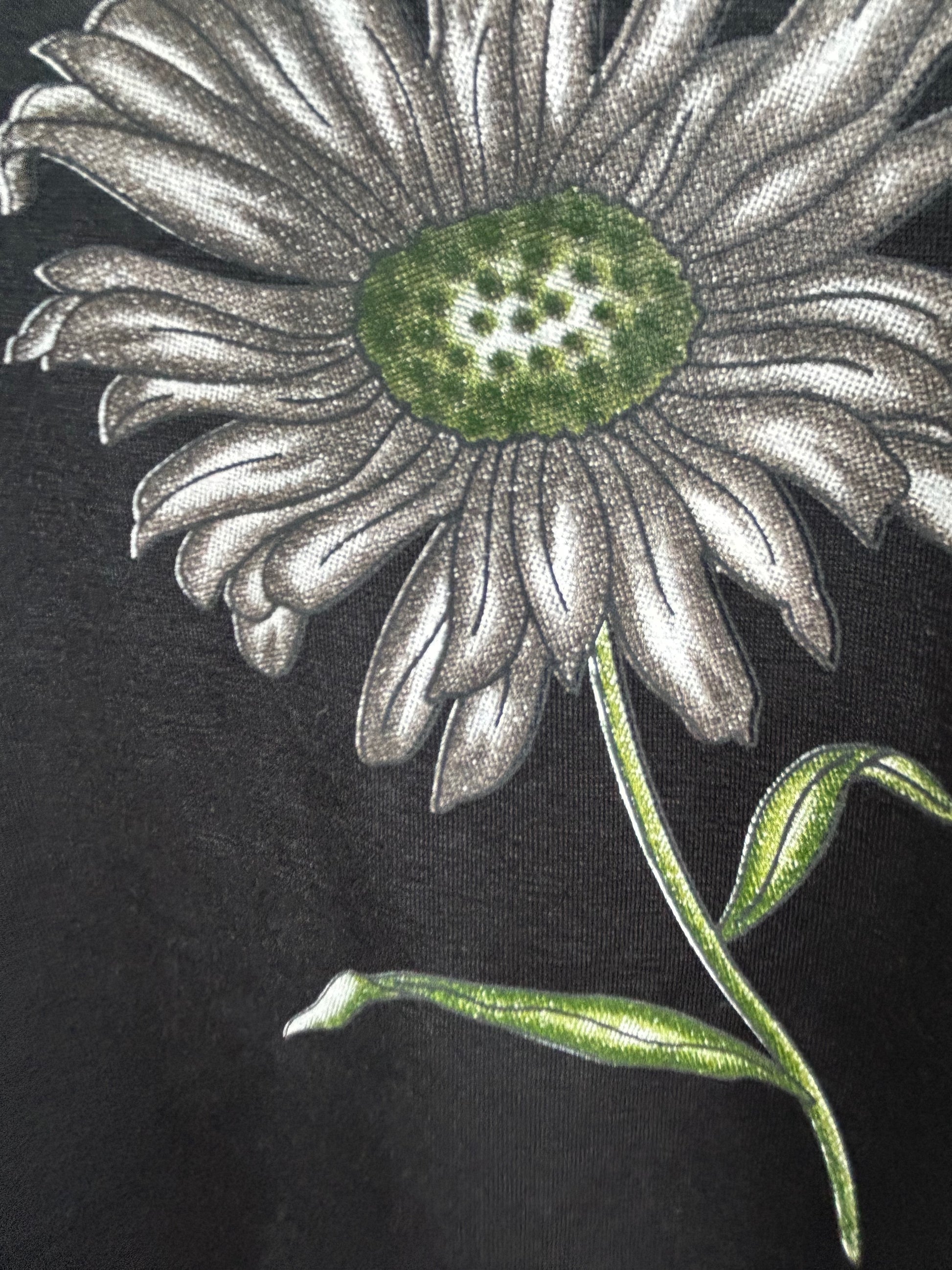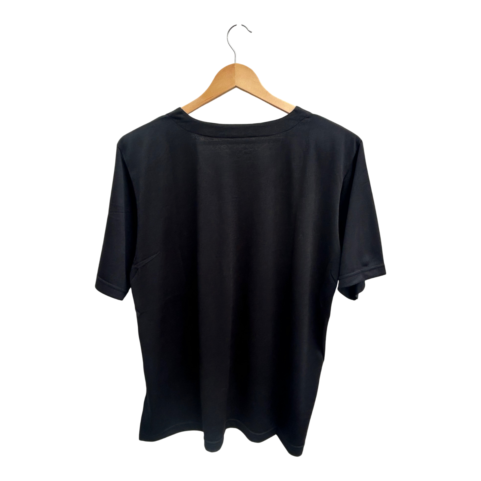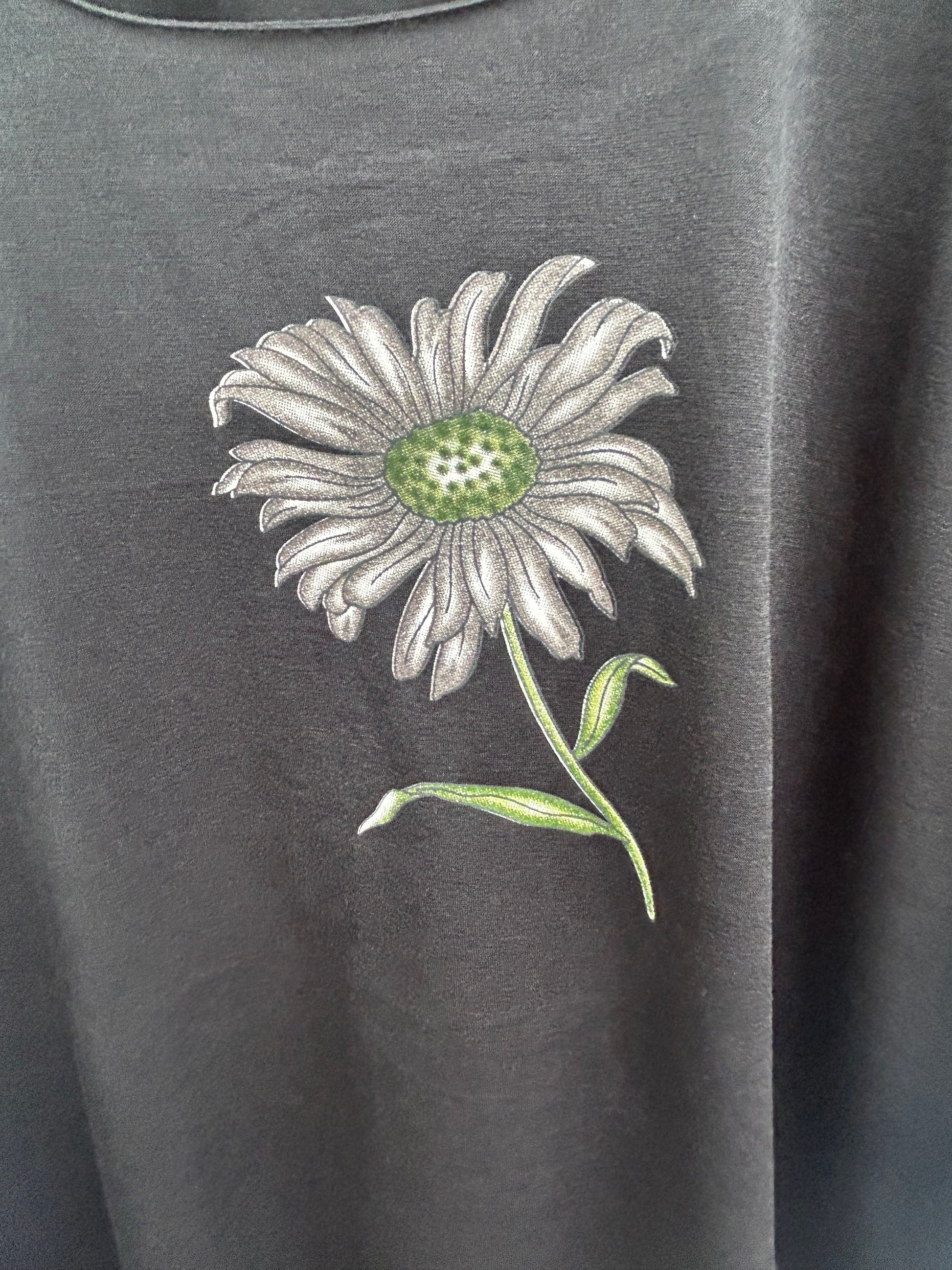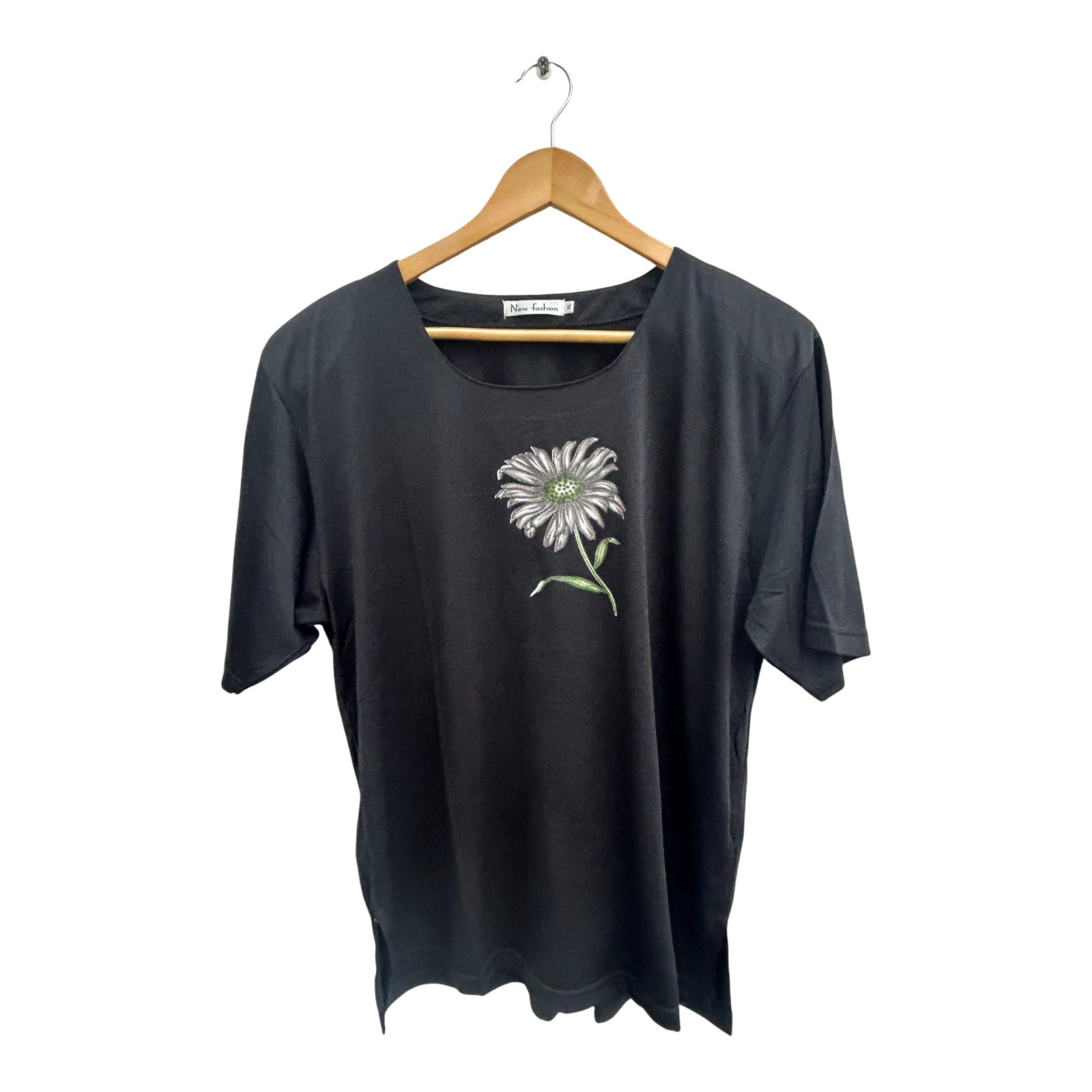 Vintage-Shirt von New Fashion in Größe XL, ohne Etikett, vermutlich Baumwollmix. Die Brustweite beträgt 60 cm, die Länge 69 cm. Das schwarze Shirt hat eine große Blume auf der Vorderseite, kleine Schulterpolster und seitliche Schlitze, was ihm einen klassischen und leicht strukturierten Look verleiht. Der Stoff ist weich und etwas fester im Griff. Ein zeitloses Stück im Retro-Stil, das sich vielseitig kombinieren lässt. 🌿