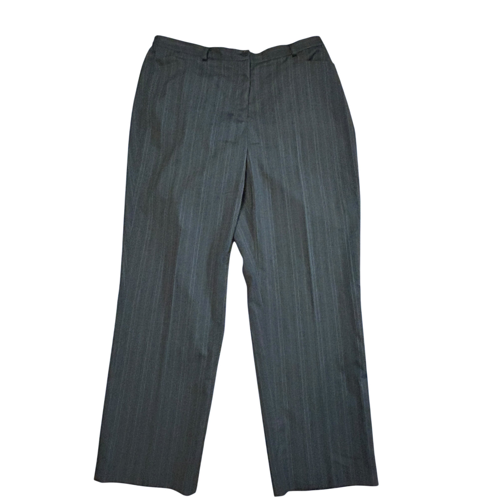 Schlichte, leichte Stoffhose in Kurzgröße 23 in Grau mit dezenten bräunlichen Streifen. Das Modell ist aus dünnem Polyestergewebe gefertigt und eignet sich besonders gut für wärmere Tage oder für den Büroalltag.