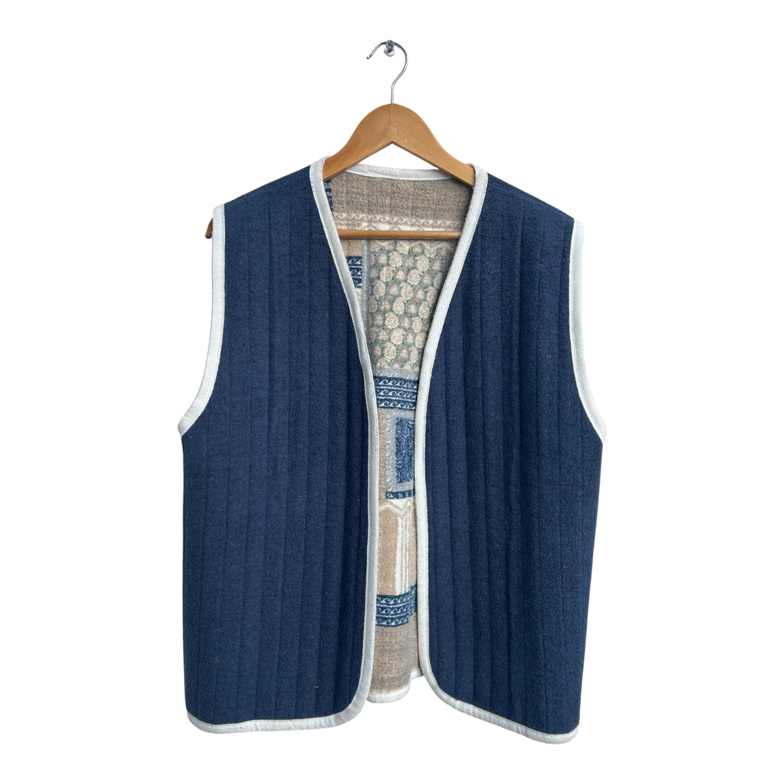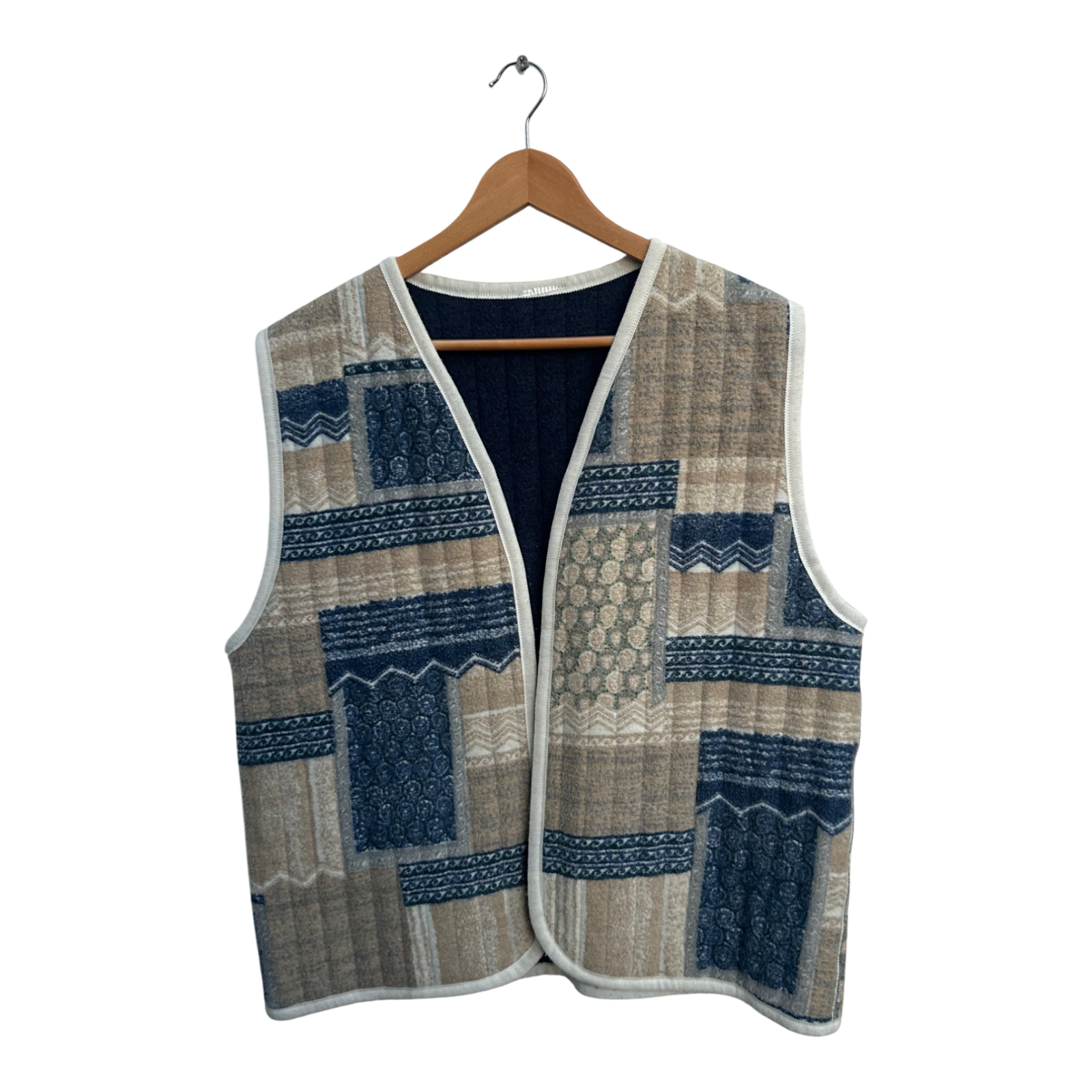 Wunderschöne wendbare Vintage-Weste in Wolloptik – außen mit Patchwork-Muster in Beige und Blau, innen schlicht dunkelblau. Das Material ist weich, warm und angenehm zu tragen – perfekt für kühle Tage im Herbst und Winter.