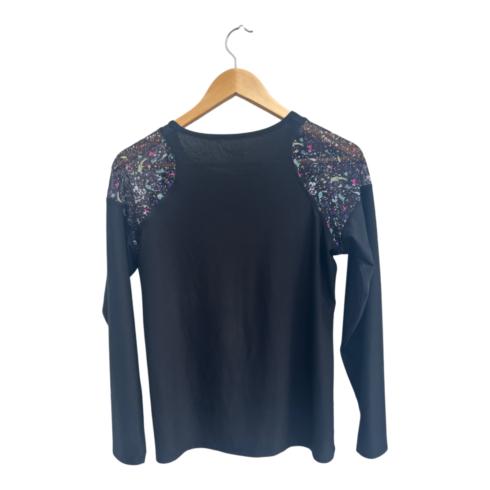 Sportliches Langarmshirt von Vogo Athletics in klassischem Schwarz mit bunten Schulterdetails. Das Shirt in Größe L hat eine Brustweite von ca. 50 cm und eine Länge von ca. 60 cm. Gefertigt aus 92 % Polyester und 8 % Spandex ist es elastisch, atmungsaktiv und angenehm zu tragen. Durch den figurnahen Schnitt eignet es sich perfekt für Fitness, Yoga, Laufen oder andere sportliche Aktivitäten.