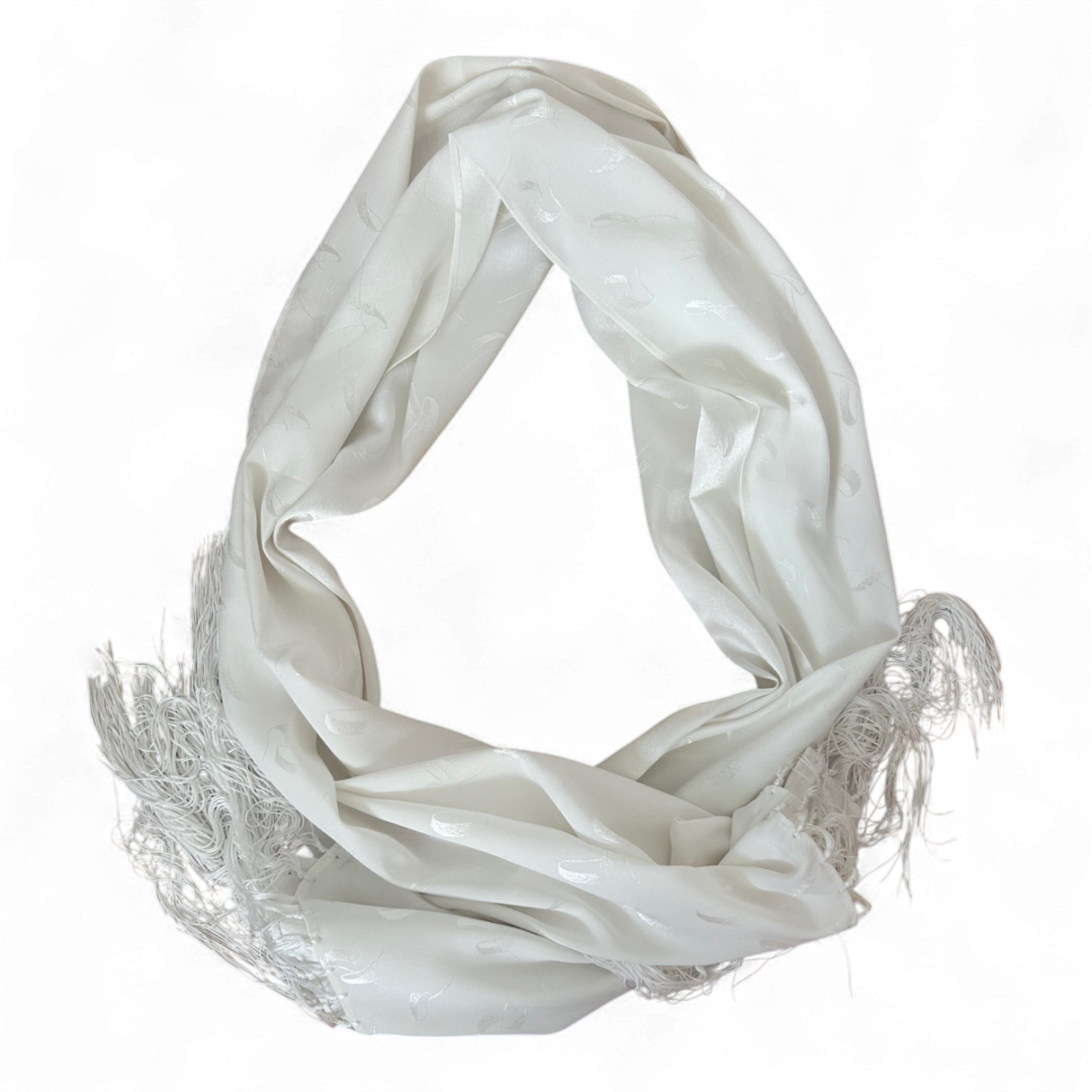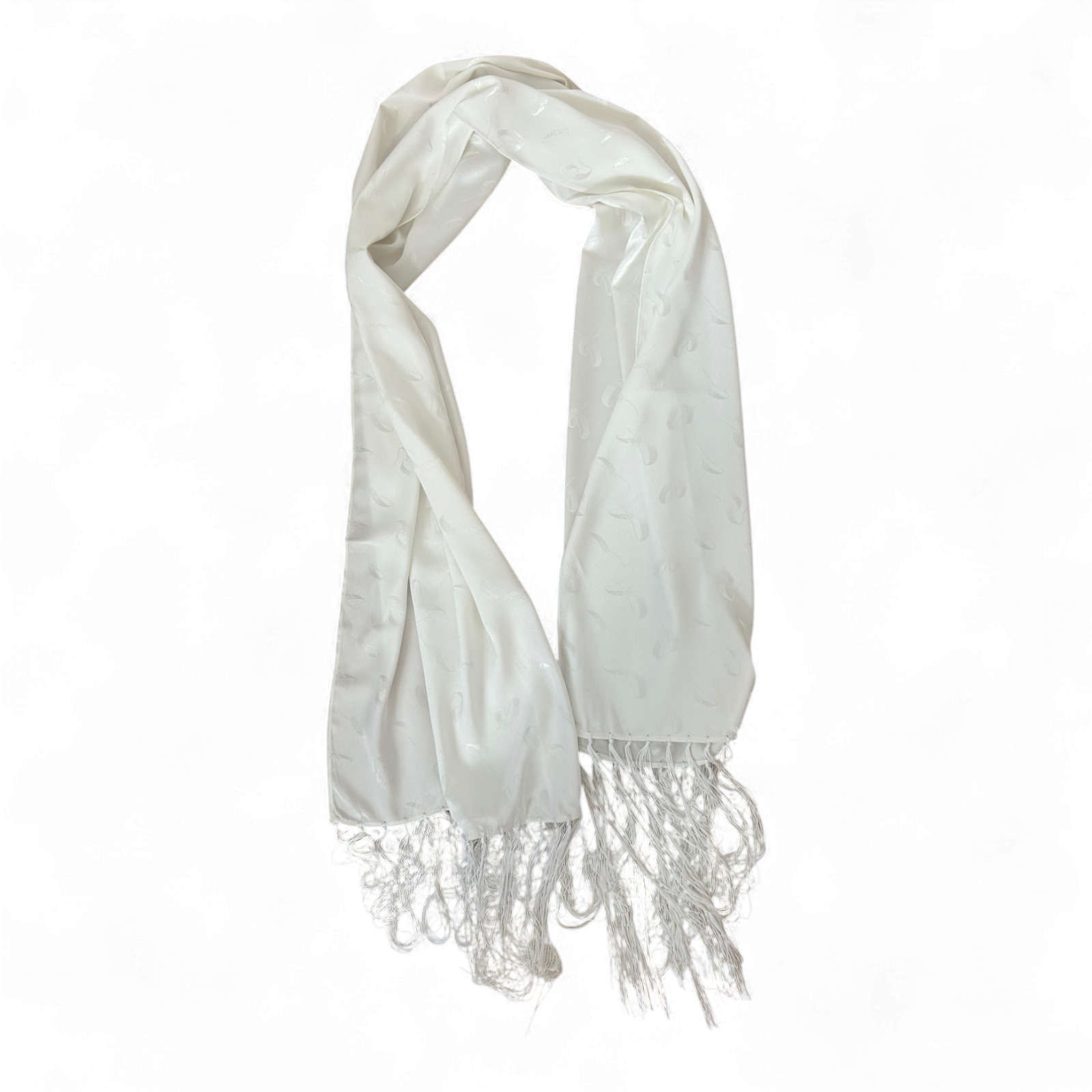 Dieser elegante weiße Schal überzeugt mit seinem dezenten Glanz ✨ und einem geschmeidigen Griff. Die feine Struktur mit Ton-in-Ton-Muster wirkt stilvoll und unaufdringlich 🌿. An den Enden zieren aufwendig geknüpfte Fransen das Accessoire und verleihen ihm eine besondere Note 🎀. Mit einer Größe von ca. 52 x 155 cm eignet sich der Schal ideal für verschiedene Tragevarianten – ob locker gelegt, gebunden oder über die Schultern gelegt 🧣. Perfekt für Büro, Feierlichkeiten oder stilvolle Freizeitlooks 💼🌙.