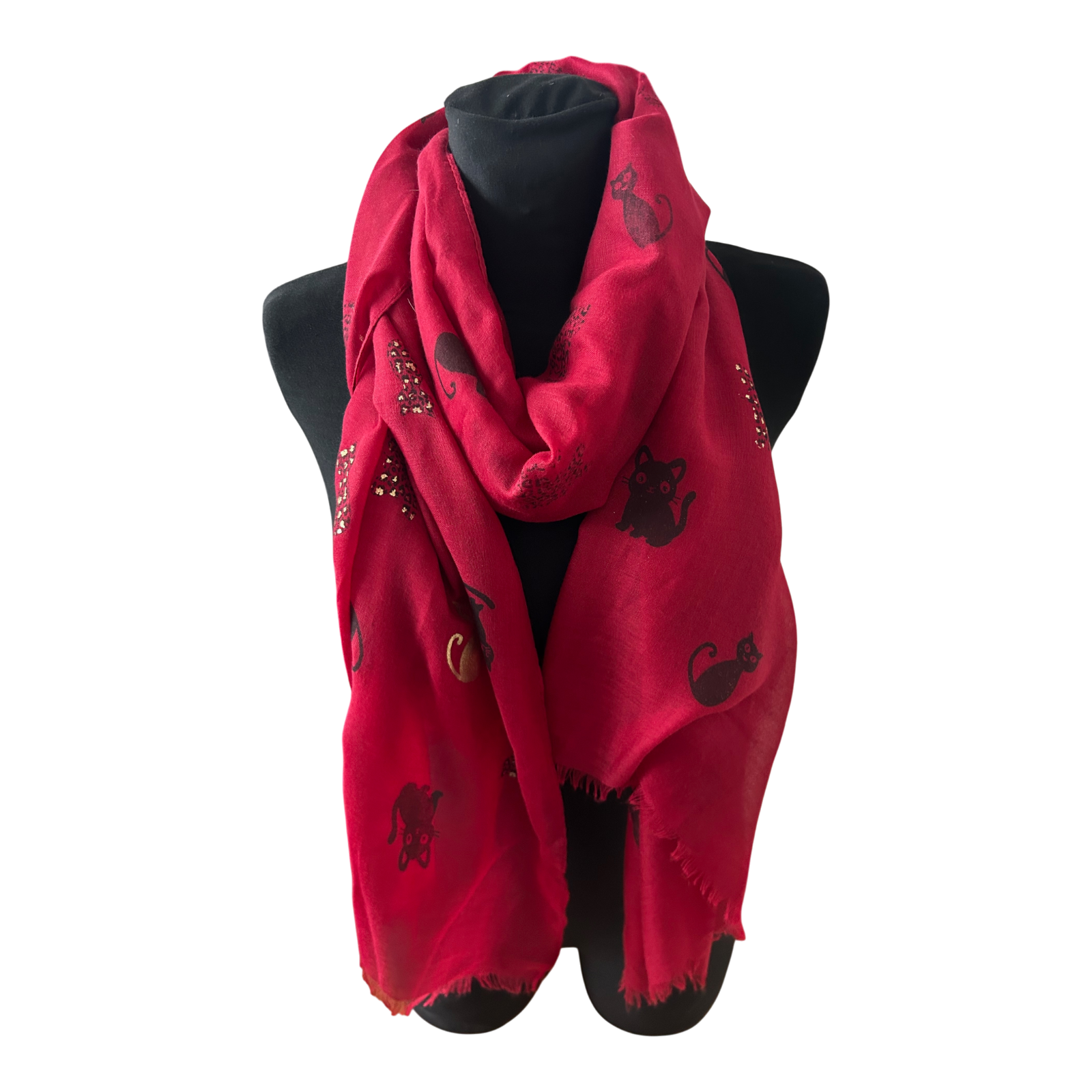 Dieser wunderschöne Katzenschal ist ein echter Hingucker und verbindet verspieltes Design mit eleganter Ausstrahlung. Auf dem kräftig roten Grund zeigen sich stilisierte Katzenmotive in Schwarz und Gold, ergänzt durch kleine dekorative Akzente.