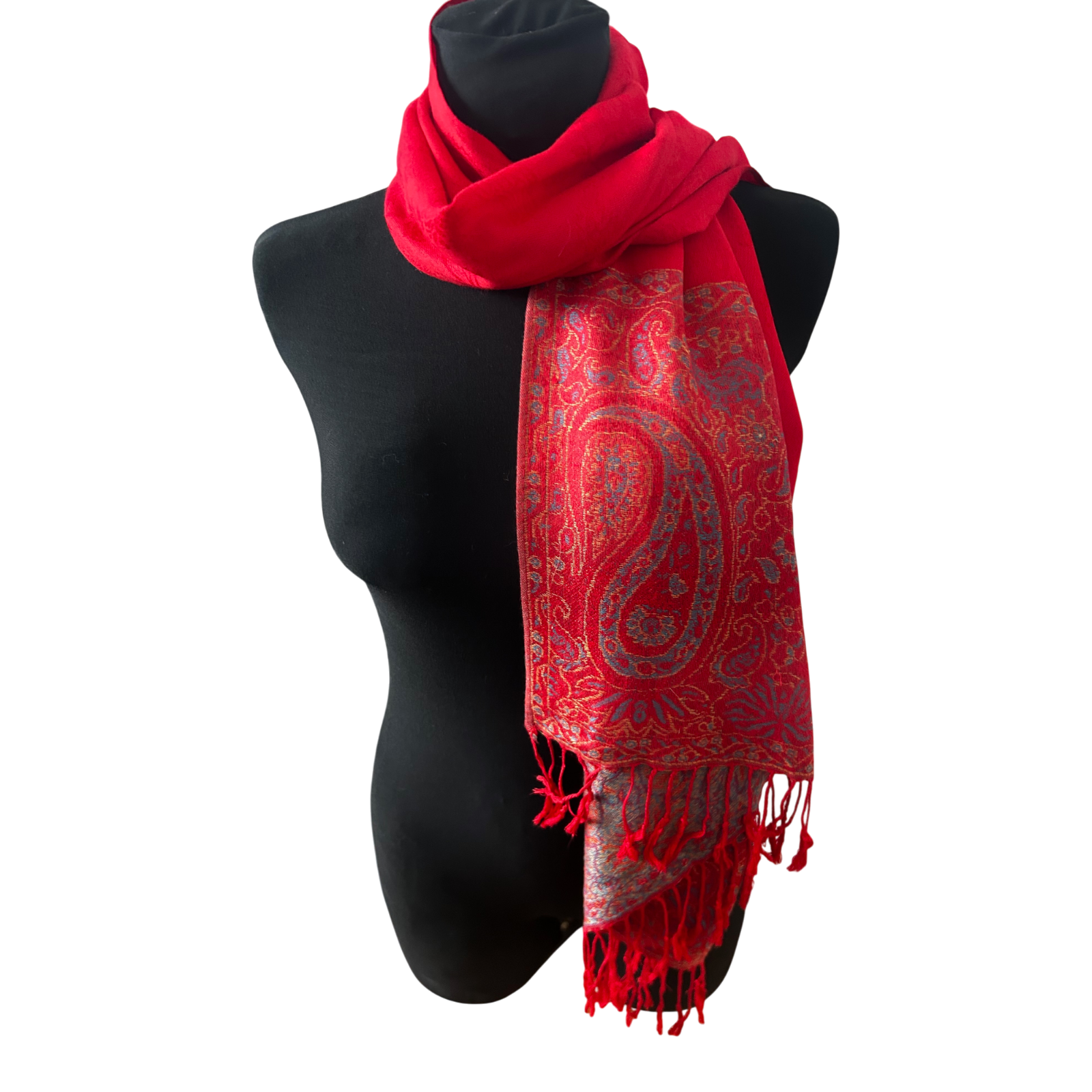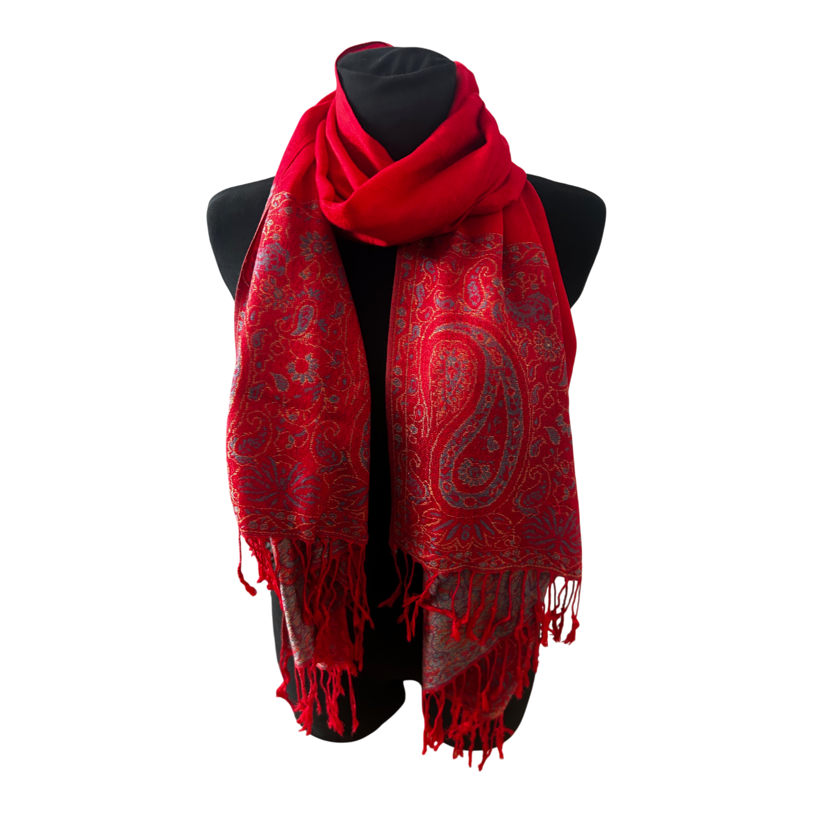 Dieser wunderschöne Schal begeistert mit einem klassischen Paisley-Muster in kräftigem Rot, ergänzt durch edle goldfarbene und feine blaue Akzente. Das Design wirkt zeitlos, elegant und zugleich ausdrucksstark.