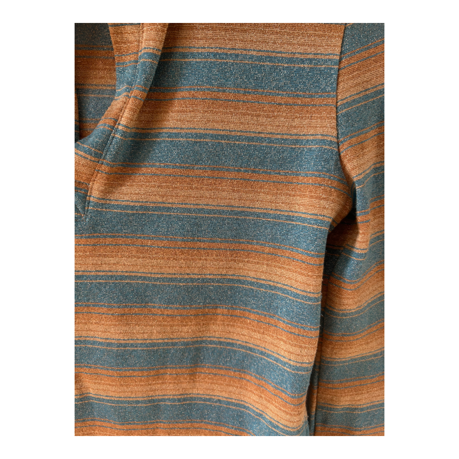 Seltenes Vintage Shirt von Yes or No, gefertigt in Frankreich, Größe M. Das Oberteil besticht durch sein gestreiftes Design in Blau und Braun mit feinen Glitzerfäden. Durch den Polokragen und die 3/4-Ärmel wirkt es sportlich-elegant und zugleich außergewöhnlich. Mit einer Brustweite von ca. 41 cm und einer Länge von ca. 52 cm sitzt es figurbetont und dank des Stretch-Anteils angenehm bequem.