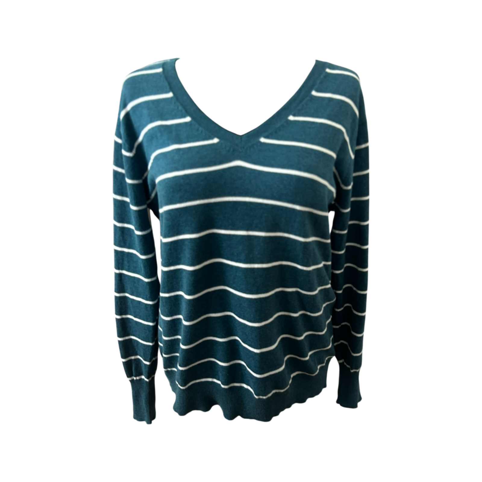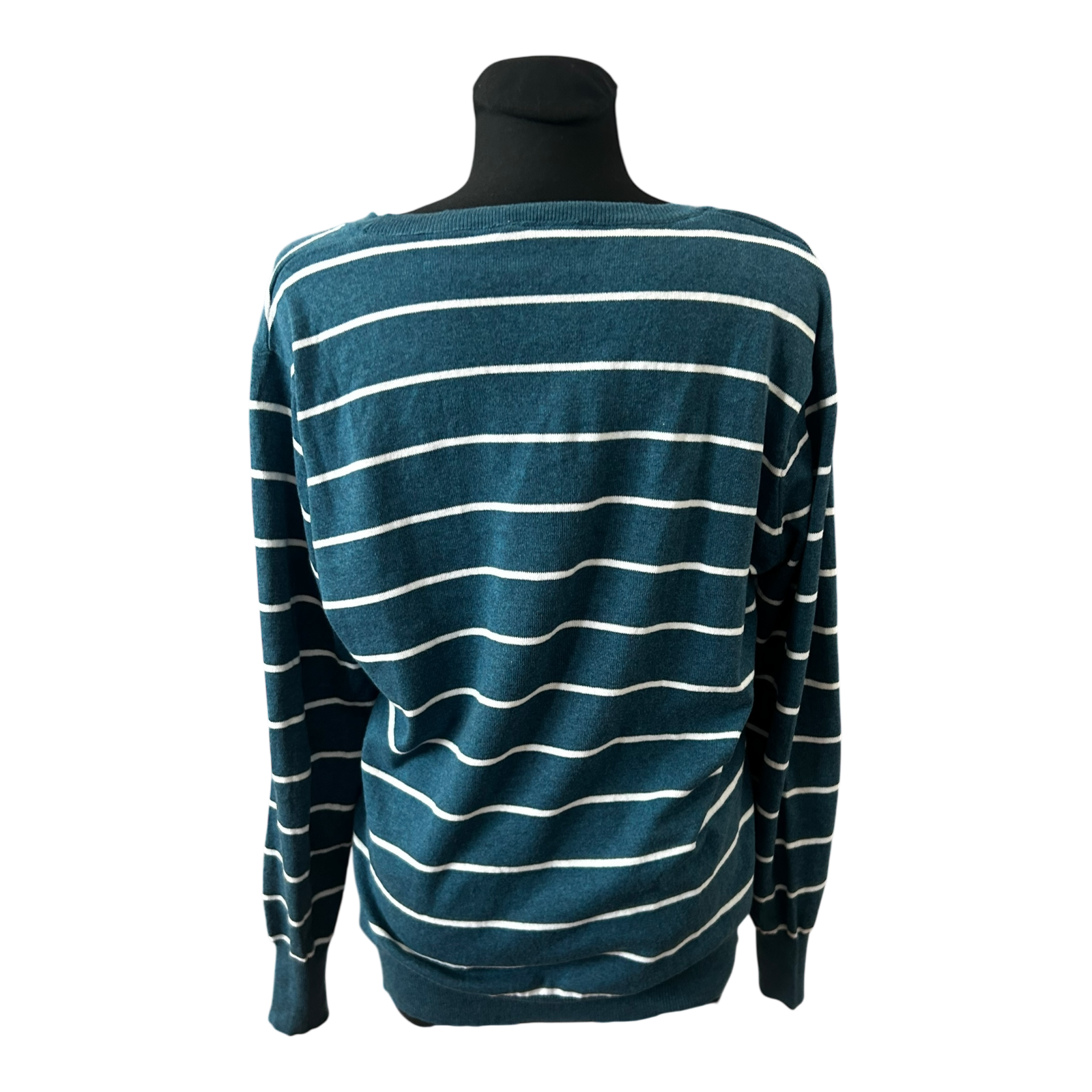 Yessica Damen Pullover XL Petrol Weiss Gestreift V Ausschnitt Feinstrick