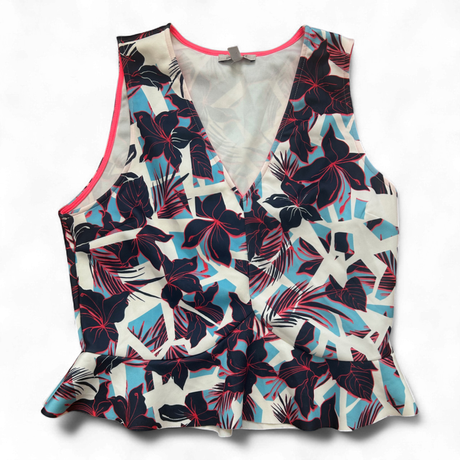 Dieses sommerliche ärmellose Top von ZARA begeistert mit tropischem Blumenprint in Blau, Rot und Weiß. Es ist tailliert geschnitten, angenehm leicht und perfekt für warme Tage oder den nächsten Urlaub! Die Brustweite beträgt 50 cm, die Länge 54 cm. Das Material ist weich und leicht dehnbar. 🌿✨